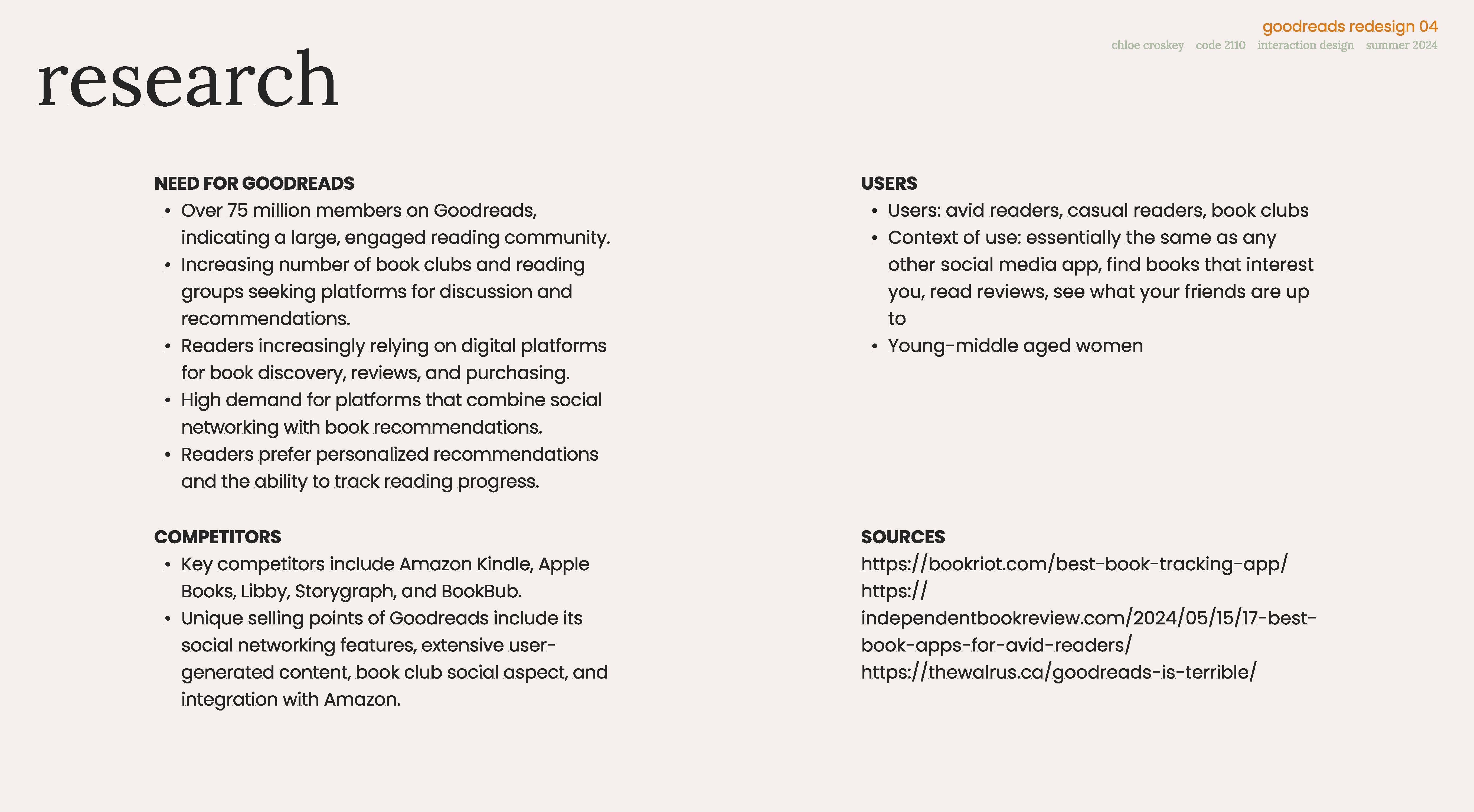 Process The Goodreads app was redesigned using user research, personas, and streamlined user flows to address pain points and improve functionality. A modern aesthetic and interactive prototype were created to enhance usability and align with readers' needs.